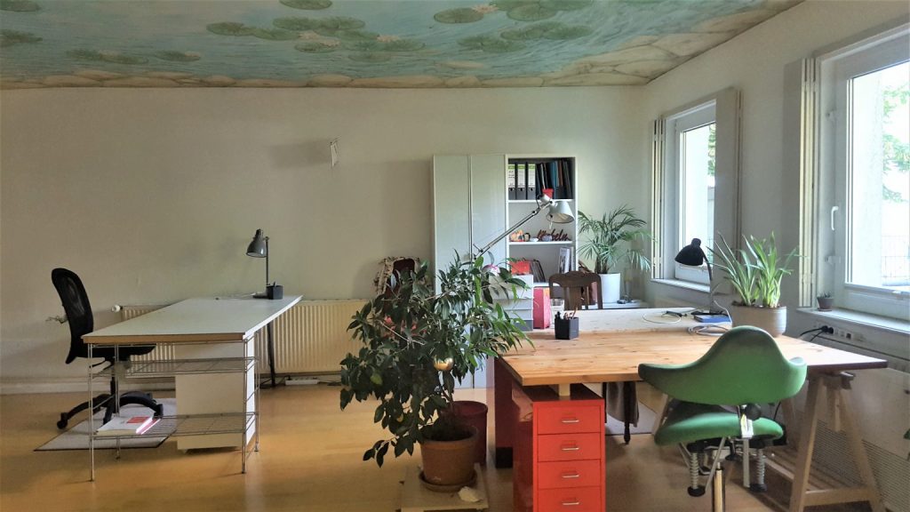– Über eine Schiebetür kommst du vom Gemeinschaftraum in das 57m² große Bürozimmer mit Deckengemälde.